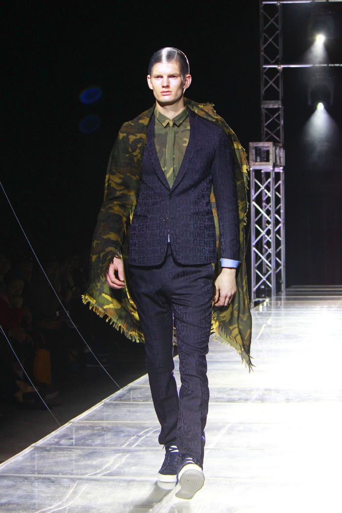 ジャケットやシャツ、ストールに施されたヨシオクボのカモフラージュ柄は健在であり、細身シルエットのジャケットの下にブルゾンやダウンをレーヤードするなど、着こなし方にも注目だ。