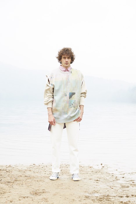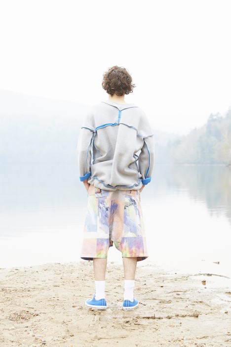 bodysong.のコレクションは、インパクトある繊細なグラフィックや、アバンギャルドなデザインに目が行きがちだが、今シーズンはグリッチジャガードやベロアグラフィックをはじめ、多様な生地とグラフィックの組み合わせがより新鮮味を与える。