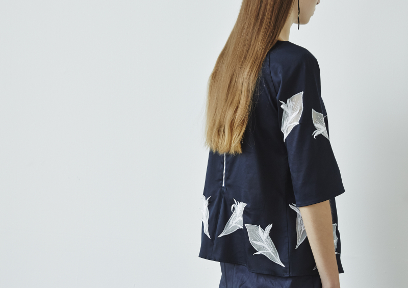 メインのカラーパレットはホワイト、ダークグリーン、ネイビーの三色。ホワイトとダークグリーンのコントラストが美しいトップスなどは、新緑の季節にふさわしい、さっぱりとした気品ある佇まいを醸している。シックなネイビーのアイテムは凛とした女性にぴったりのイメージだ。レースや化繊の透ける素材を使った切り返しのアイテムも多く、涼しげでどこかセンシュアル。遊び心ある植物柄のワンピースやジャケットはシンプルに新鮮さを演出している。