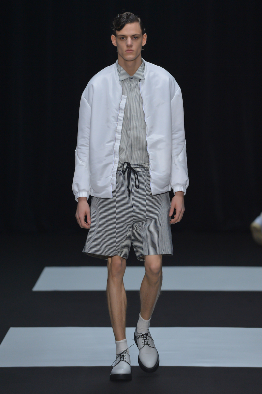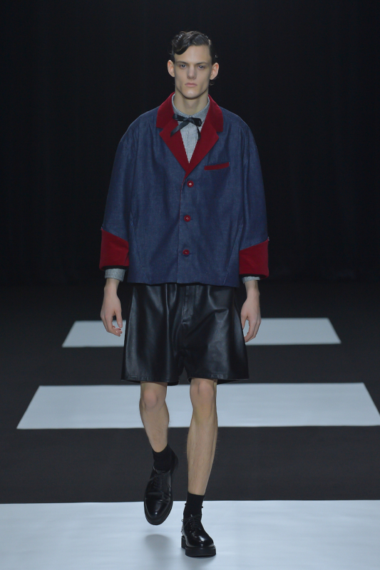 シックでタイトなルックがでてきたと思ったら、 大きなシルエットのルックが登場したり、チェリーを被った英国ボーイが登場したりと、ショーの構成にあえて韻を踏まない演出をルックで見せた。