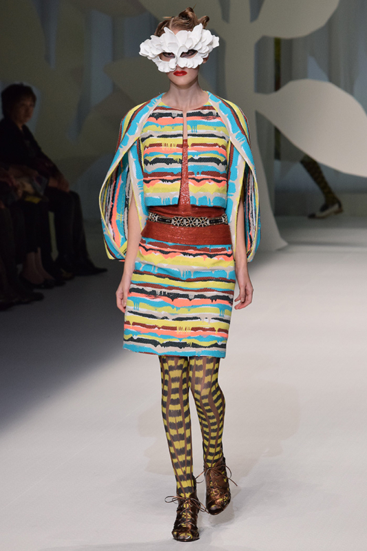 ショーはピアノの柔らかな音楽から始まり、ポップに描かれた花のルックからスタート。繊細なデザインはタイツやカバンまでに及ぶ。タイツや靴下には切り絵のようなタッチで細かく草木、花の模様が刻まれている。ハンドバッグも立体的なデザインで組み合わされたような作りに 。