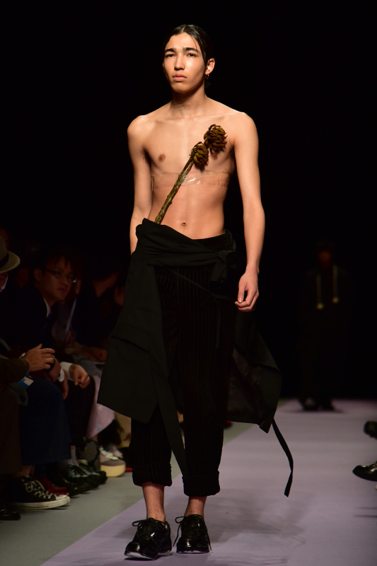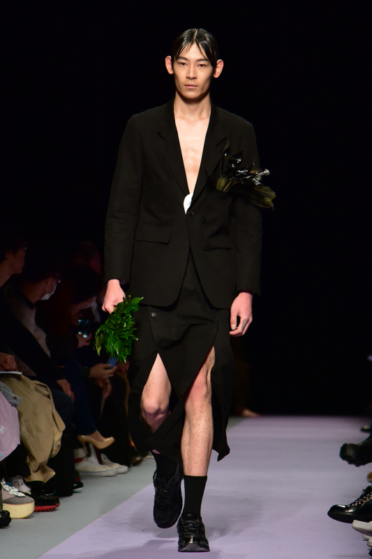 このルックでは横沢氏自身「私の祖母が呉服店を経営しておりまして、その時に周りにあった服のインスピレーションが強い」と、話してくれた。祖母の服を見てインスパイアを受けたとは思えないぐらい刺激的で情欲を催すルックである印象を受けるのは、レザー生地、タイトなシルエット、ミニスカートなどのアイテムのインパクトであろう。一方で、花柄や、足袋、編み込みの粗いストールなど昔ながらの服の良さ、素材を大事にするというメッセージ性をも感じさせる。「なんでもない日々に収まりきらなかったこと」をコンセプトとしているkotoha yokozawa。そこからはみ出たものと昔ながらのもの。それを、彼女なりのニュアンスで女性的に仕上げたルックではなかっただろうか。