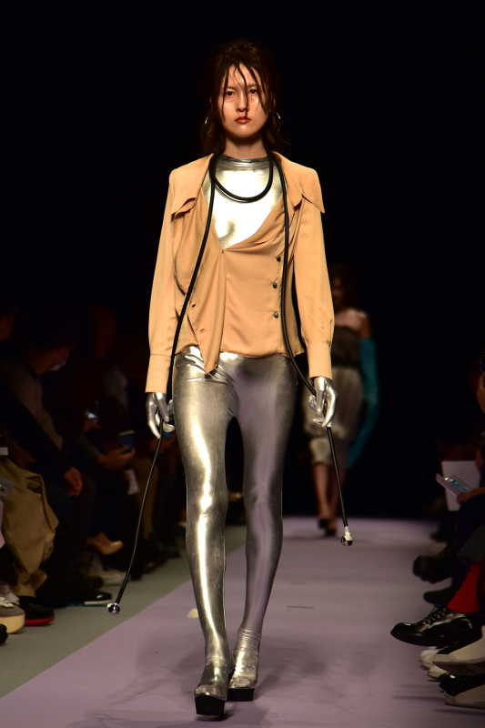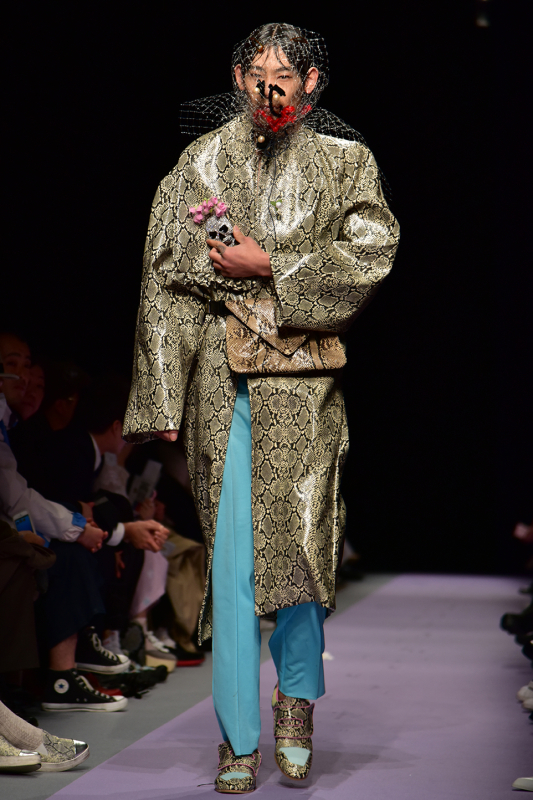 NirvanaのアルバムNever mind に収録されているstay awayが流れショーがスタートした。今回のルックでは、前回の根暗な10代の少年少女のイメージから、スケボー、ロック、異性等色んなカルチャーや刺激と出会う事であか抜けていく様子をショーで象徴していた。彼のコレクションでは、各アイテム毎でトレンドを追ったアーバンな服を使っているが、彼の作品として合わせた瞬間にとても土臭いスタイリングで、少年少女たちの青臭さが巧妙に表現されていた。フィナーレでt.a.t.uの「all the things she said」が流れるなど、思春期の自分の世界に入り込み、世の中に対して何か反発しているような選曲がショーの中で純粋な少年らしさというよりも「中二病的」な 様子を醸し出していた。