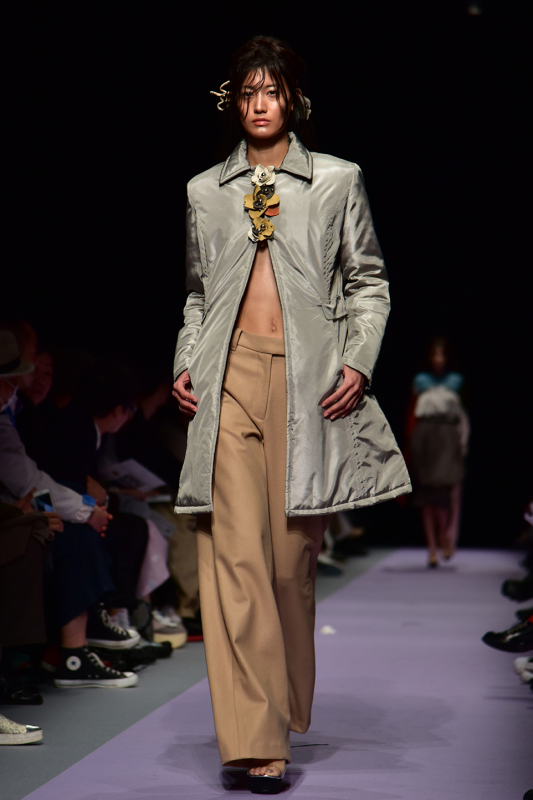 今回は「なにかを諦めた女性」物憂げなテーマのコレクションであった。1920年代の女性の戦時の様子から感応を受け、ルック中に登場する軍服は兵の傷を施す看護師を表しているという。青木氏は「思想的にも、何かを求めるじゃなく、諦め全てを許容する。そういう考えで作りました。」と、答えてくれた。ルックではチェック柄のアイテムや肌の露出の多い服装が目立つなど「諦める」という言葉とは変わって、アグレッシブなメッセージが取れる。戦時中という比較的身を守ったり、隠す風潮のなか、すべてを覚悟し脆弱な中光り輝く女性の強さを垣間見ることができた。